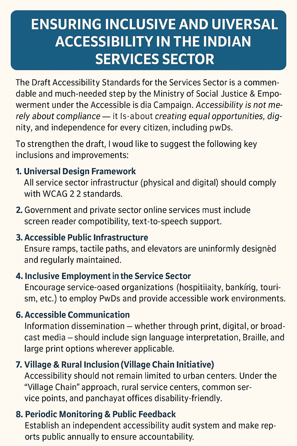 Ensuring universal accessibility in the service sector is vital for building an inclusive and empowered India. The Draft Accessibility Standards under the Accessible India Campaign are a visionary and commendable step.