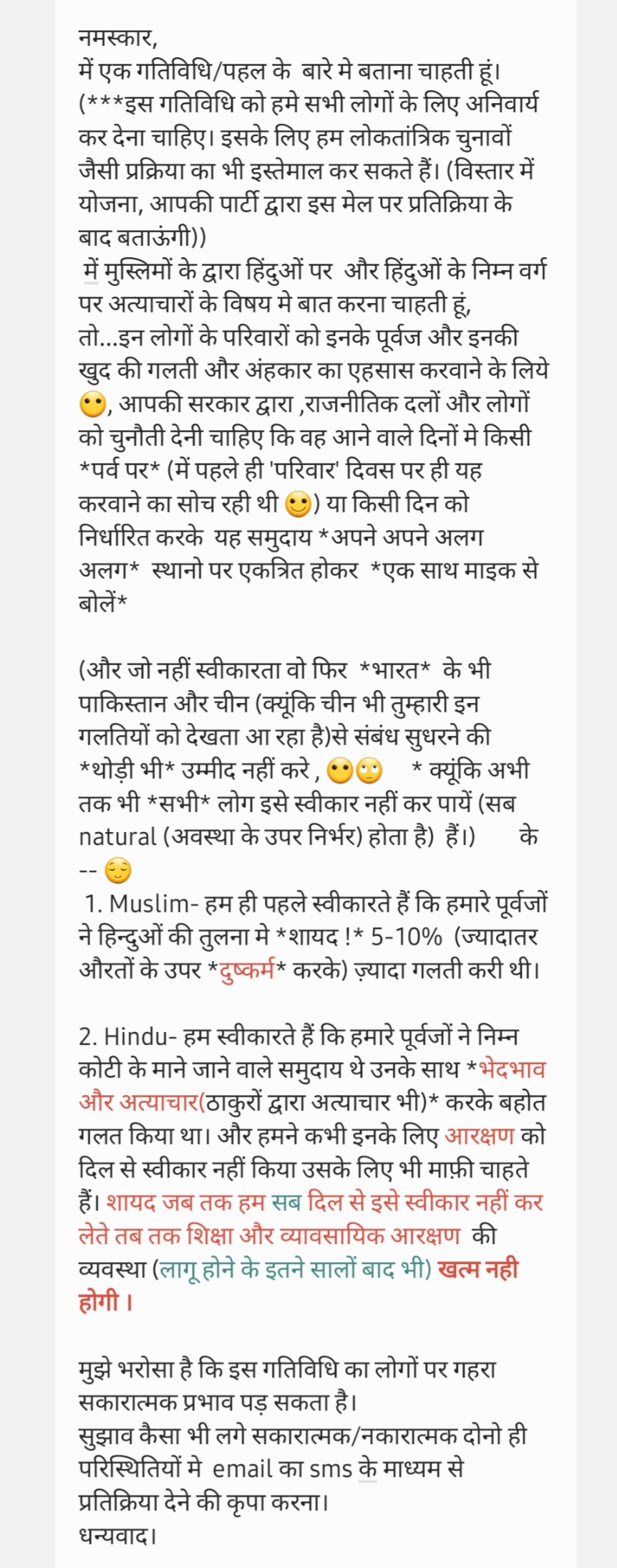 (***इस गतिविधि को हमे सभी लोगों के लिए अनिवार्य कर देना चाहिए। इसके लिए हम लोकतांत्रिक चुनावों जैसी प्रक्रिया का भी इस्तेमाल कर सकते हैं। (विस्तार में योजना, आपकी पार्टी द्वारा इस मेल पर प्रतिक्रिया के बाद बताऊंगी))